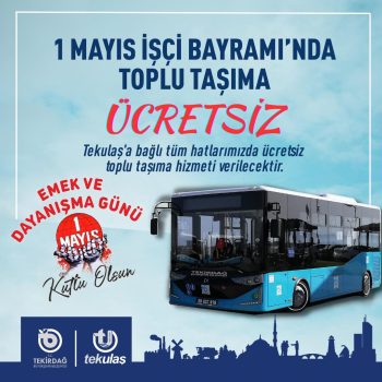 1 Mayıs Emek ve Dayanışma Günü dolayısıyla, Tekirdağ Büyükşehir Belediyesi TEKULAŞ tarafından işletilen toplu taşıma araçları, faaliyet gösterdiği tüm güzergahlarda halkımıza ücretsiz olarak toplu taşıma hizmeti verecek.