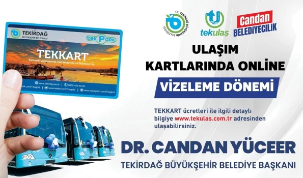 Her alanda olduğu gibi ulaşım alanında da vatandaşlara kolaylık sağlamaya devam ettiklerini belirten Tekirdağ Büyükşehir Belediye Başkanı Dr. Candan Yüceer, “Ulaşımda online kart vizeleme dönemini başlatıyoruz. Online kart vizeleme uygulaması ile vatandaşlarımız, hem yüzde 50 indirimden faydalanabilecek hem de kart işlem merkezlerine gitmelerine gerek kalmadan işlemlerini kolaylıkla yapabilecekler. Online vizeleme ile kart ücreti 40 TL’den 20 TL’ye düşüyor. Tüm vatandaşlarımıza hayırlı olsun” dedi.